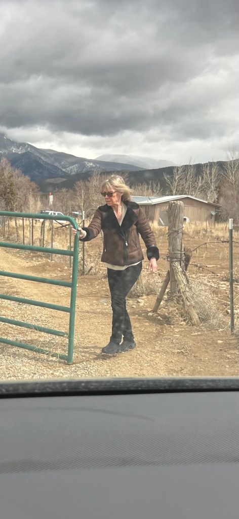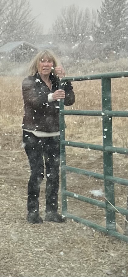 Mrs. T seen here wrangling said gate in the snow… what a cowgirl! While I am at it, I might mention not only do I travel with my personal travel agent but also my personal trainer!