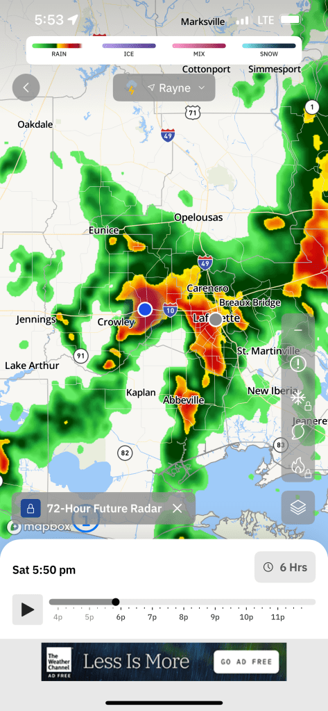 As usual coming into Louisiana we were inundated with horrendous storms. Not you usual, “Oh the sun will be out soon, let’s just keep going,” rather the “Holy shit we are going to die” sort of storm. We had to exit off Interstate 10 three times because the visibility was about 6 feet, and that is the distance I had to keep so I could see the vehicle in front of me to continue safely. The last time we turned off we waited at a gas station for an hour and a half while the storm stalled over our location. By the time the rain let up there were many cars stranded on the streets due to the high water. For some reason, and this is not throwing shade on this particular car (actually one of my personal favorites), but most of them were Challengers. Street in front of the gas station seemed to be relatively dry so, what the hell, off we go. The locals recommended going into Lafayette by way of Highway 90 and not the interstate. Now you have to believe the locals, right? There was one caution that I missed. They said 90 never floods, but getting to it was not a sure thing. Not a sure thing was deep south for “Boy, you’re going to feel some pain.”