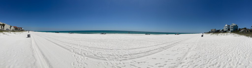 Hope this website does this panoramic picture justice. The sand here is like fine salt and the water is an amazing shade of blue. Beautiful, clean, and the sand is way too clingy. It gets everywhere!